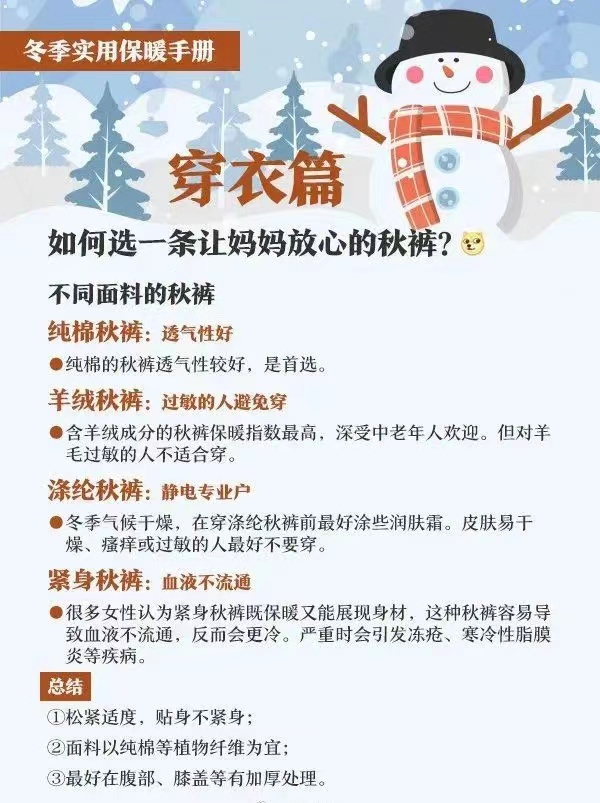 2.冬季穿衣注意“三暖一凉”:一是手暖、二是肚暖,三要足暖,四要头凉。