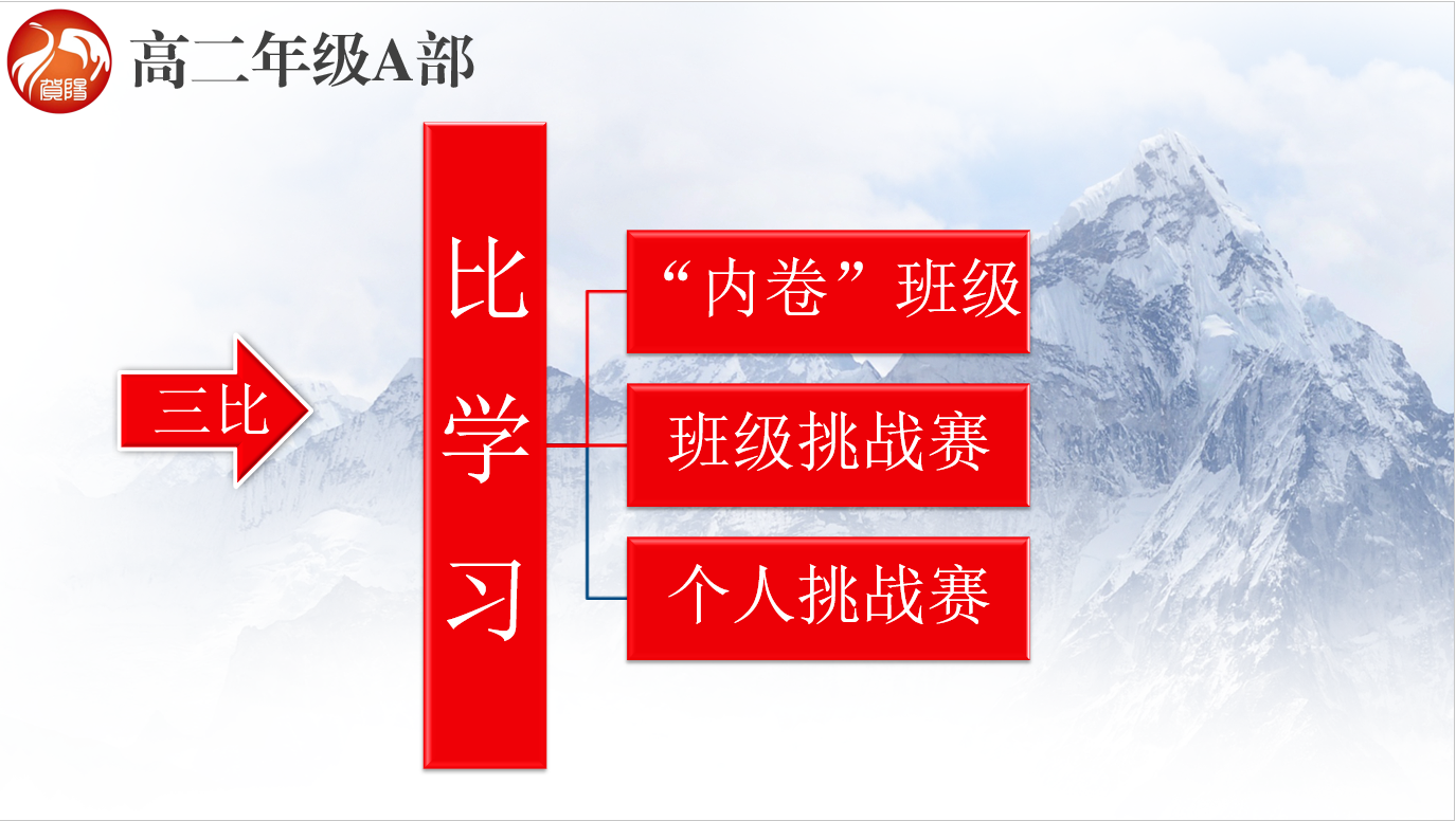 前方的苦难挡不住青春的激情,奔向梦想的勇士整装出发!为提升学生学习的自觉性、积极性,激励同学们不断超越、勇攀高峰,营造“比、学、赶、帮、超”的良性竞争氛围。“比学习”项目将进行“内卷班级”、“班级挑战赛”和“个人挑战赛”三项活动。“内卷班级”通过学生会学习部统计各班一周内晚三下课后自觉晚归寝自习的人数进行评选。“班级挑战赛”和“个人挑战赛”通过班级内下战书、学生之间下战书的形式开展,一次挑战赛,就是一次新的秣马厉兵。挑战对方,也是挑战自己的极限。