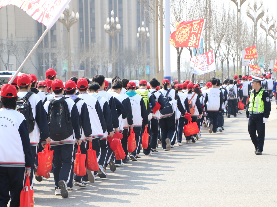 校领导在前方引领,班主任老师一路陪伴守护,交警叔叔挺直腰板,尽职尽责为学子开路,医务人员紧随队列,为同学们的生命安全保驾护航,同学们队伍整齐,并肩前行,嘹亮的歌声,激情的口号,尽显青春的活力与蓬勃的朝气,俨然成为一道亮丽的风景。
