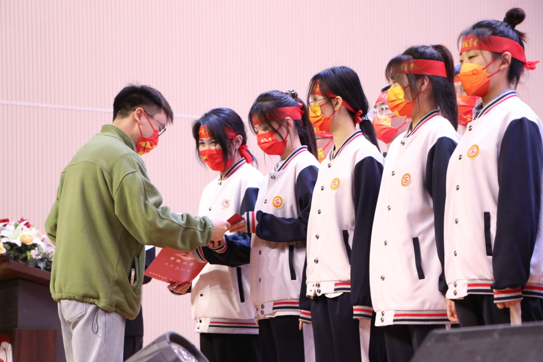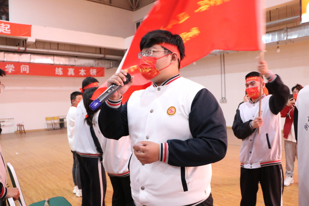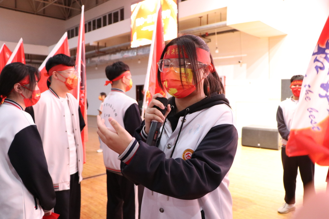 秦书记为高三年级授高考冲刺战旗。徐校长并为各班代表授班旗。最后各班进行宣誓。